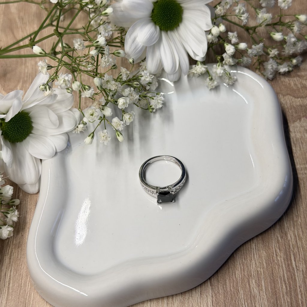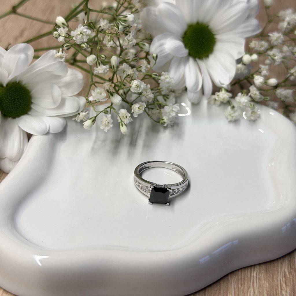 Tento elegantní prsten ze sterlingového stříbra zaujme na první pohled svým výrazným, vyvýšeným černým zirkonem, který je pevně uchycen ve čtyřech krapnách.