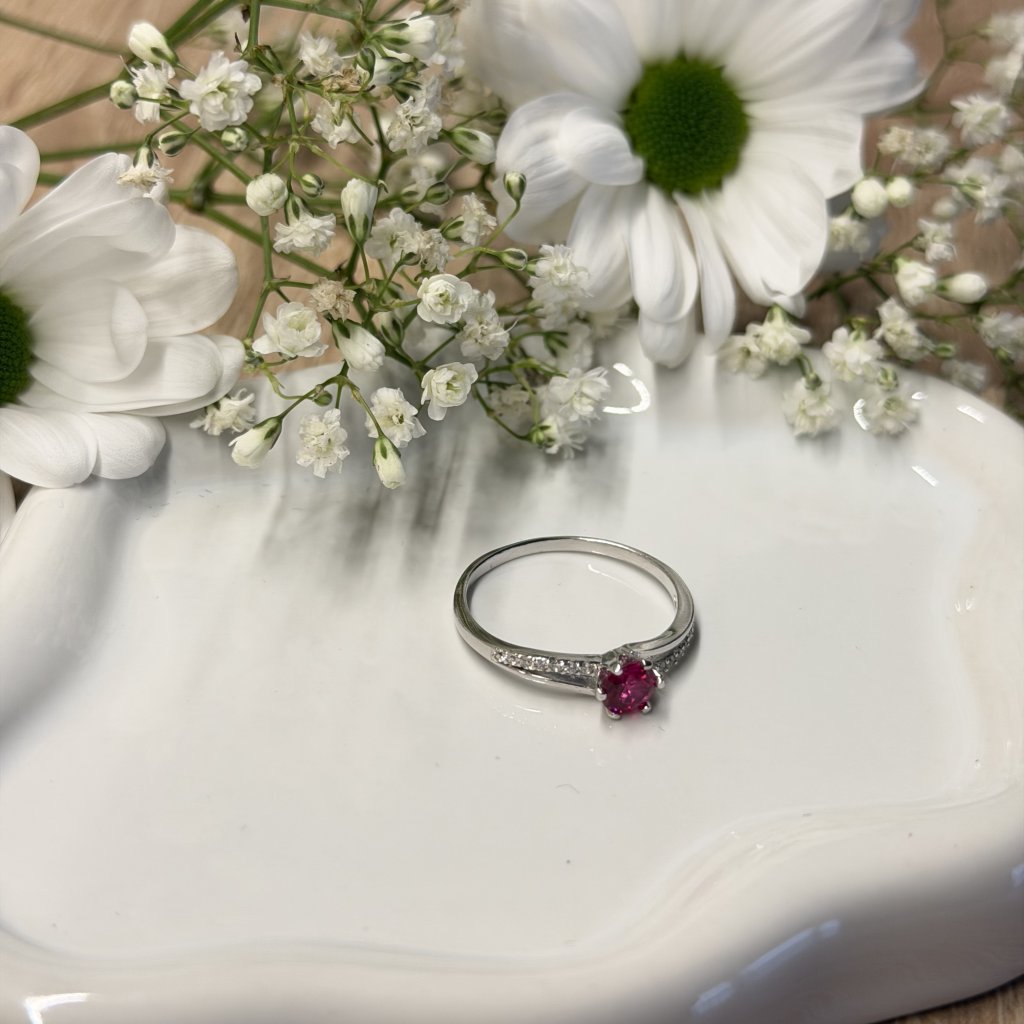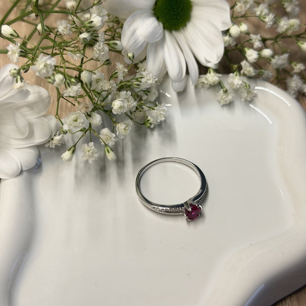 Růžový zirkon ve vyvýšeném lůžku dodává prstenu něžný a ženský charakter. Jeho jemný lesk přitahuje pohled a vytváří šperk, který působí romanticky a výjimečně.